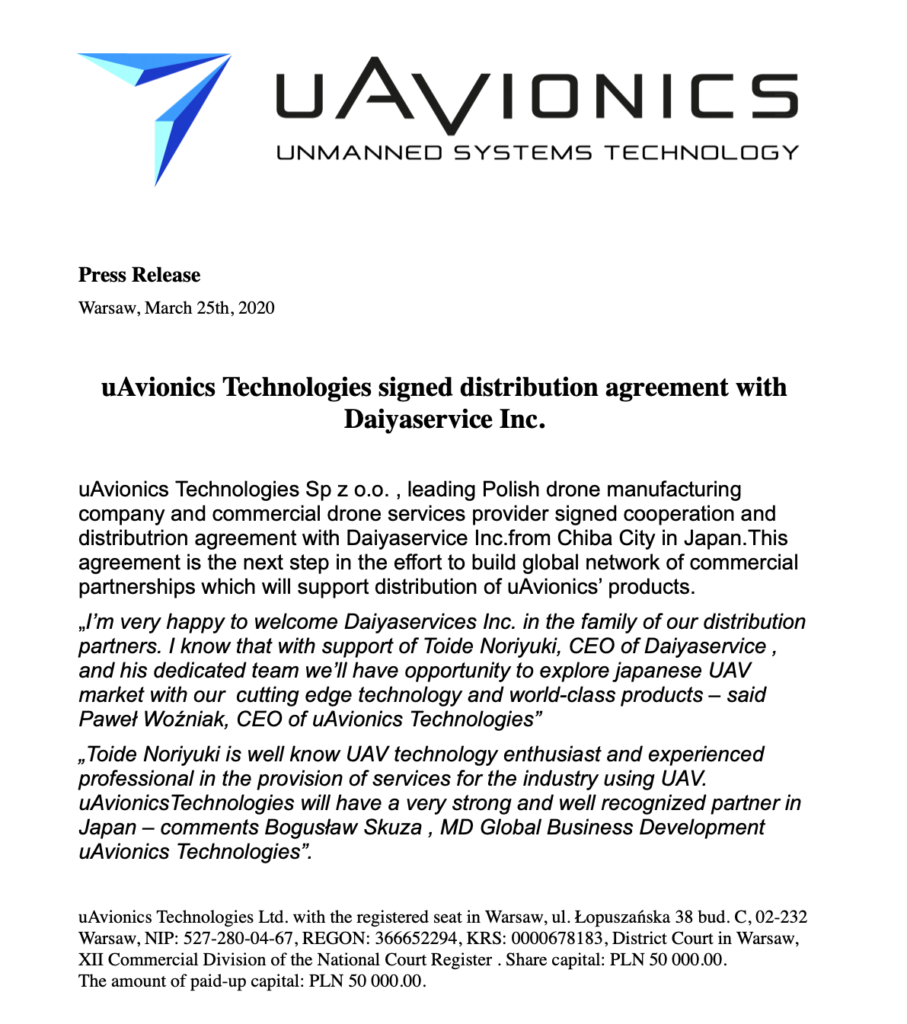 ドローンサービスプロバイダの株式会社ダイヤサービス(本社:千葉県千葉市花見川区、代表取締役:戸出智祐、以下当社という)は、2/24付でポーランドのUAVメーカー「uAvionics Technologies」社と日本国内のディストリビューター契約を締結いたしました。
