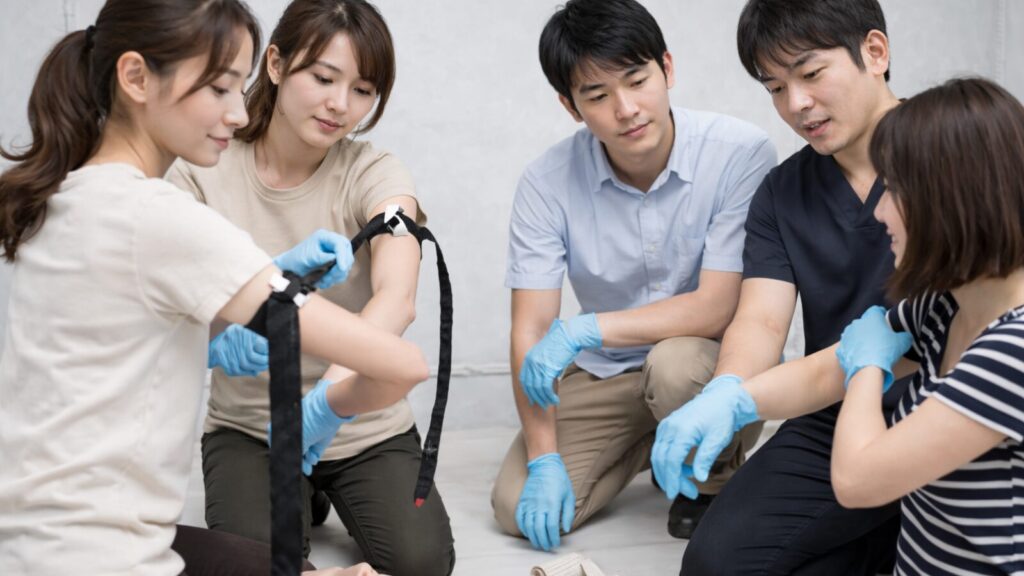 | 消防の講習との違い | ターニケット装着・シーネ固定・バッテリー発火対応・MIST(救急隊への引き継ぎ)など、消防の上級救命講習では扱わない項目を体系的に習得可能 |